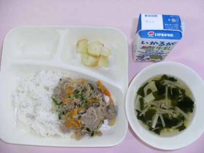 豚肉、糸こんにゃく、たまねぎ、にんじん、青ねぎを甘辛く煮、ご飯にかけていただきます。