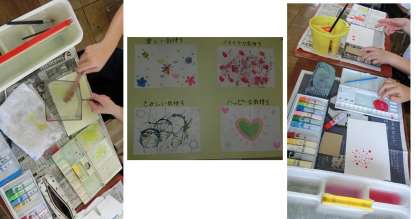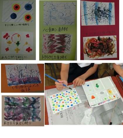 「明るい」「楽しい」「いらいら」「怒り」「孤独」「さみしい」などなど、様々な心の気持ちが表れるように、材料や用具の使い方を工夫して表現しました。