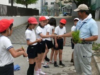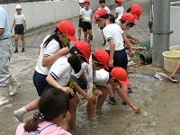 5年生の子どもたちは、6日(金)総合「かがやき」の学習で、大阪市農業協同組合の方に”田植え”の仕方を教えていただきました。米のさいばいの過程や、苗の植え方を教えていただいた後、実際に校内にある田んぼで、田植え体験を1人ずつしました。ぬるぬるな土の感触や、まっすぐ苗を植える難しさに、なかなか苦戦している子もいましたが、「楽しい♪」「もう1回やりたい♪」とみんな大喜びでした☆☆