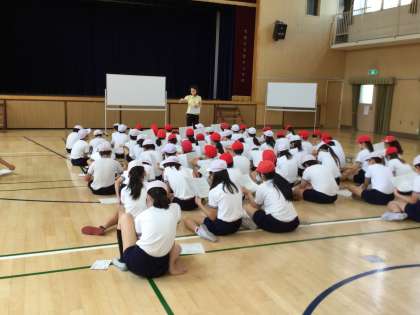 1年生の反復横跳びの測定が終わった後、6年生は講堂に残り、5月29日(雨天時は6月1日に延期)に行われる「1年生ようこそ集会」に向けての自分たちの役割について、先生から説明を受けました。