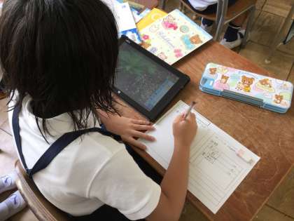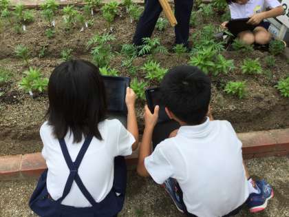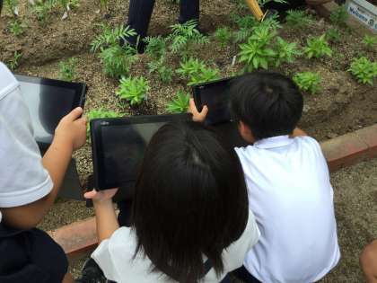 タブレットで5月8日に植えたホウセンカとマリーゴールドの写真を撮って、観察を行いました。