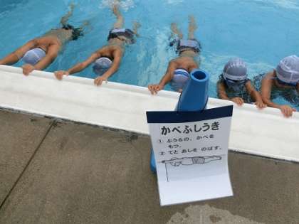 6つの場所にわかれて「けのび」や「ふしうき」などの練習をしています。今日は変えたてのきれいな水で冷た〜い!!でも、見て見て!と何度ももぐってやる気まんまん。明日は1年生と共に夏休みプールの準備をします。