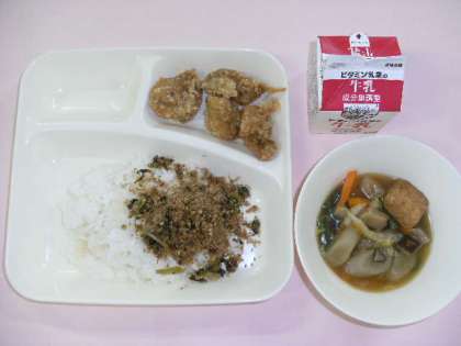 かつおぶし、だいこん葉、いりごまに調味料を加えていためた、ごはんに合う一品です。
