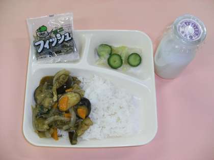しょうが・にんにく・牛肉・にんじん・たまねぎ・なすを炒めてだしとうす上げを加え、カレールウなどの調味料で味付けし、ごはんの上にかけていただきます。