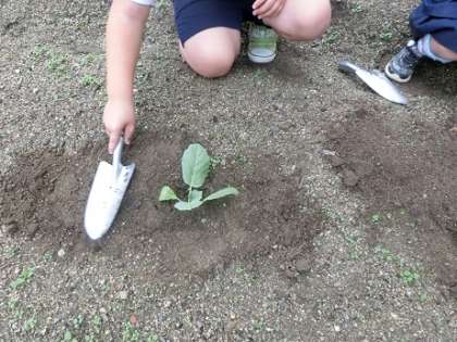 3年生になる春にむけて、学習園にキャベツの苗を植えました。自分たちでなく、モンシロチョウの幼虫のためです。初めての理科学習でチョウの観察をします。虫が大好きっ子たちは目を輝かせています。