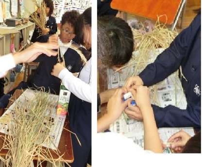 今回は手作りの「千歯こき」だけでなく、牛乳パックを使った脱穀も行いました。