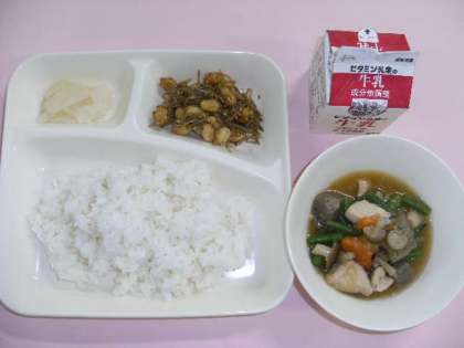ゆでたちりめんじゃこと、片栗粉をまぶして揚げた大豆を、甘辛いタレにからませています。