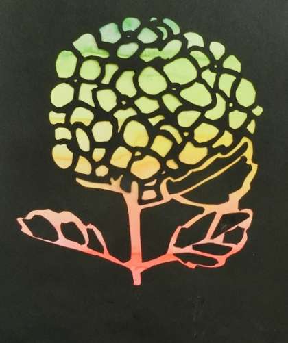 絵の具でグラデーションを作り、その上に自分で選んで取り組んだ切り絵を重ねました。