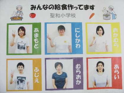 現在、聖和小学校の給食は朝日給食株式会社の6名の調理員さんが作っています。今日のような猛暑日も、安心安全でおいしい給食を一生懸命、心を込めて調理しています。