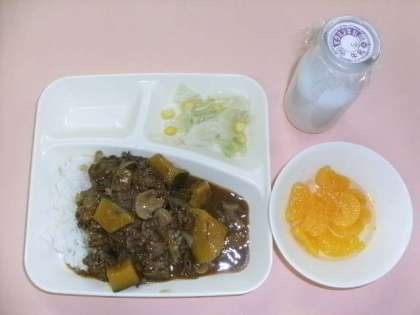 旬の夏野菜、かぼちゃ、なす、ピーマン、トマトを使ったカレーライスです。