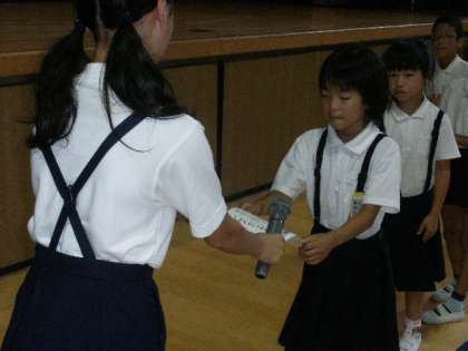木曜日の児童朝会で、美化委員会より、靴箱に靴をきちんと入れていた学級の表彰がありました。「くつそろえんジャー賞」です。