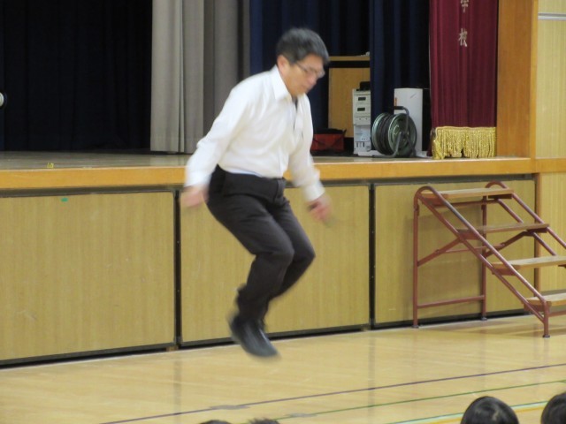 また、跳び縄(縄跳び)の正しい長さについての話では、正しい長さに調整した跳び縄で実際に児童の前で二重跳びを披露してくれました。