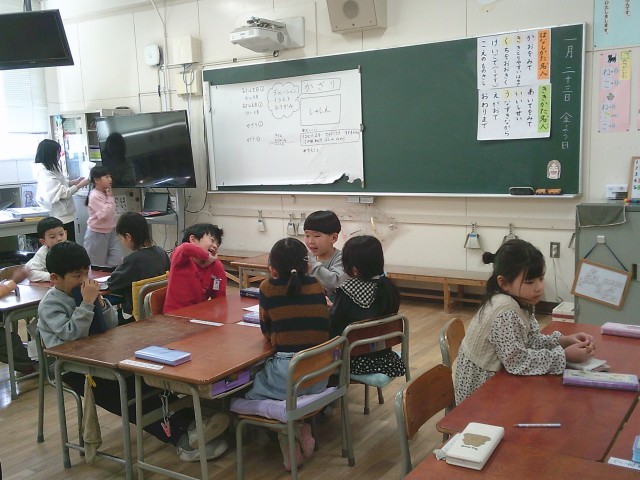 1年生の道徳では、『うちゅうせんにのって』色々なところを探検する話を通して学習をしました。沖縄の海がきれいなのはどうしてか、意見を出し合いました。「きらきらしているから」「おさかながたくさんいるから」「ゴミがないから」など、1年生らしい意見が聞かれました。