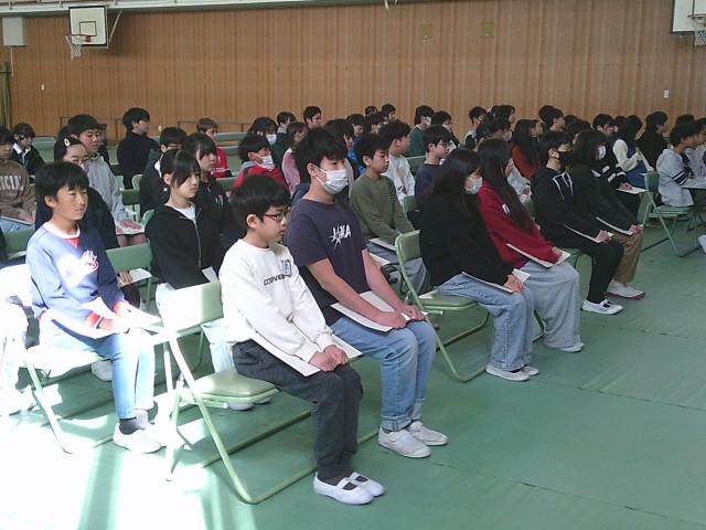 続いて、校長先生から桃の節句についてお話がありました。桃は厳しい冬を乗り越えて春、真っ先に咲く強い木であることから、悪いものをはらい、成長する姿を女の子の命や成長になぞらえました。いよいよ3月。3学期もあと10回あまり。今一度、一人ひとりのことを大切にできる自分に、と呼びかけられました。