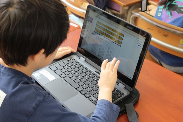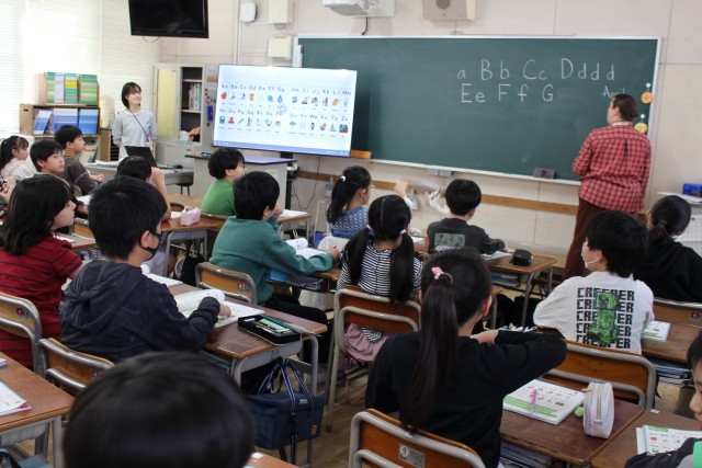 5年生の外国語の時間です。C-NETの先生から発音を学び、音と文字をつなげる学習をしていました。