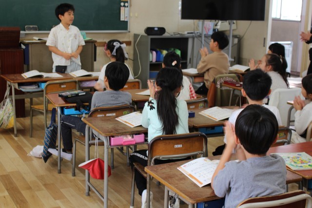 2年生の音楽の時間です。手拍子を打ちながら、言葉に付けたリズムを友だちと重ねていきながら、表現の楽しさを味わっていました。