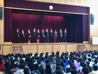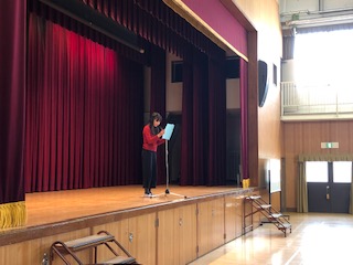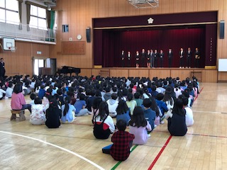 →転入児童の紹介、新転任教職員の紹介と挨拶に続き、校長先生のお話がありました。(あいうえお学校にしましょう!でしたね。)