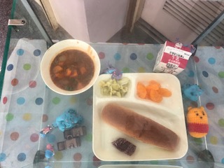 ビーフシチュー、キャベツのピクルス、みかん(缶)、パン、牛乳