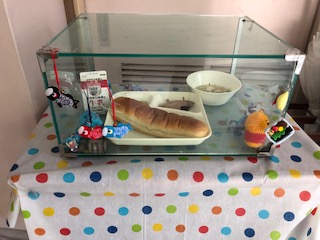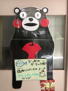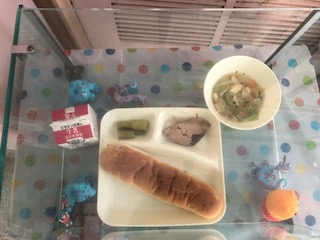 かつおのガーリック焼き、鶏肉とじゃがいものスープ、グリーンアスパラガスのサラダ、パン、牛乳
