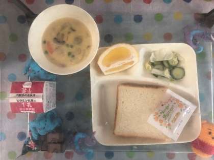 コーンクリームシチュー、キャベツときゅうりのサラダ、かわちばんかん、アプリコットジャム、パン、牛乳