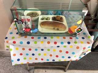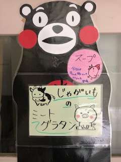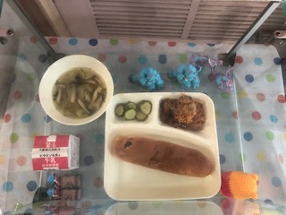 じゃがいものミートグラタン、スープ、きゅうりのピクルス、パン、牛乳