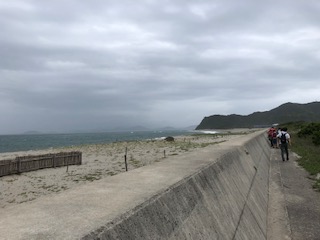 →玉ねぎ農家のアベさんの畑に向かいます。曇り空で風がきついですが、雨は降っていません。玉ねぎ抜き体験楽しみです。※強風の為、海が大シケです。白波がたくさん立っています。