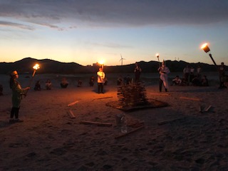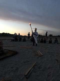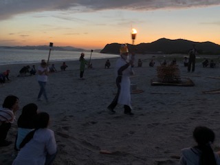 →昨夜できなかったキャンプファイヤーが始まりました。火の神の登場から全員フォークダンスまで大盛り上がりです。