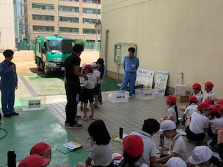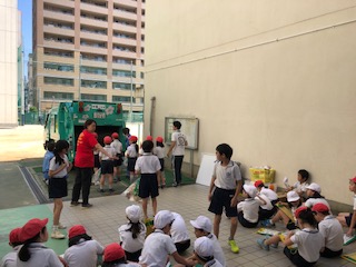 →2、3時間目に、市の環境局の方による環境学習を行いました。パッカー車体験とともに、ゴミのリサイクルのお話を聞きました。正しいリサイクルの方法を学びました。