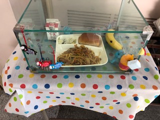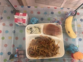 カレースパゲッティ、キャベツのひじきドレッシング、バナナ、1/2パン、牛乳