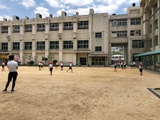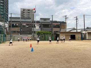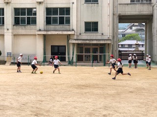→体育の授業にて「ベースボール型ゲーム」の活動を行なっていました。みんなが楽しめるように考えながら活動をすすめていました。