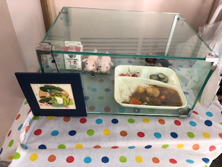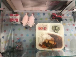 ハヤシライス、きゅうりのサラダ、さくらんぼ、牛乳