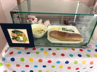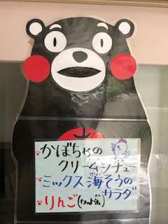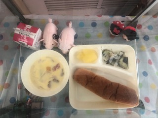 かぼちゃのクリームシチュー、ミックス海そうのサラダ、りんご、パン、牛乳