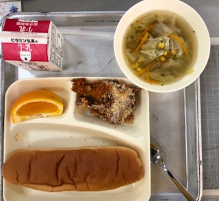 かぼちゃのミートグラタン、スープ、オレンジ、パン、牛乳