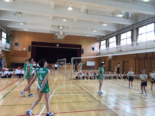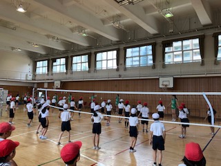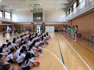 →本日、2・3時間目に、トップアスリートによる夢授業を実施いたしました。女子バレーボールチーム「JTマーヴェラス」の選手の方を講師に招いて行いました。見本での見事なレシーブ、トス、スパイクには大きな歓声が上がっていました!また、試合形式の練習も大いに盛り上がりました。