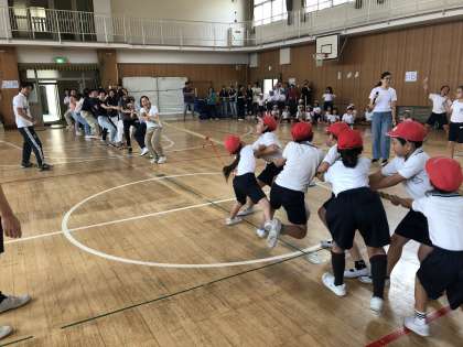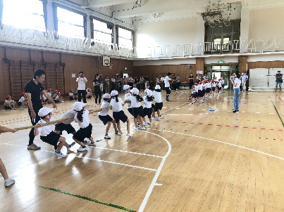⇒体育館でつな引きをしました。保護者の方々