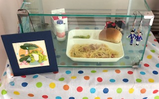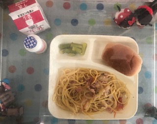 ポークトマトスパゲッティ、グリーンアスパラガスのサラダ、発酵乳、パン1/2、牛乳