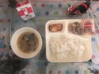 ゴーヤチャンプル、すまし汁、あつあげのしょうがじょうゆかけ、ご飯、牛乳
