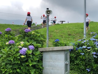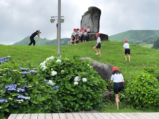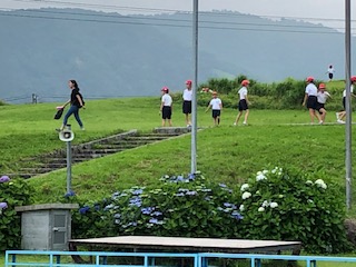 →魚つかみまでの時間、班で自由遊びをしています。鬼ごっこで走り回っています。
