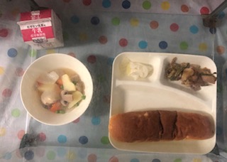 豚肉のカレー風味焼き、スープ煮、サワーキャベツ、パン、牛乳