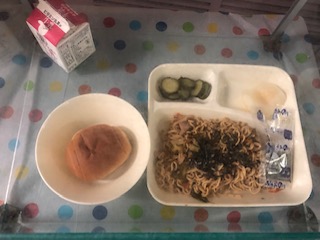 やきそば、きゅうりのあまずづけ、なし、1/2こくとうパン、牛乳