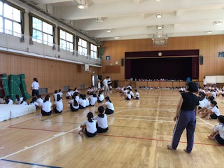 →グループ技の練習が始まりました。子どもたちはみな真剣に取り組んでいました。暑さが厳しくなってきています、体調や安全に気をつけ、短時間で効率よくすすめています。