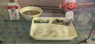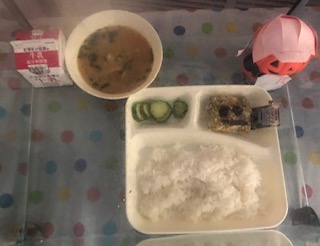 お好み焼き、豚汁、きゅうりの甘酢あえ、ご飯、牛乳