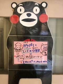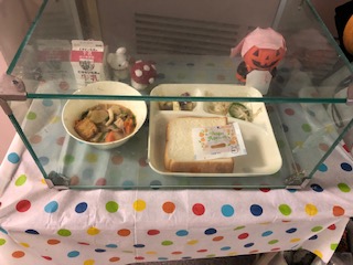 豚肉といかの中華煮、焼きさつまいもの甘みつかけ、もやしとピーマンのいためもの、パン、アプリコットジャム、牛乳