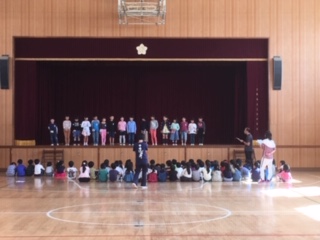 →講堂に集まって学習発表会の練習をしました。台詞を大きな声で言えるようにがんばっていました。
