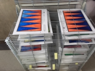 →図工の学習で絵の具の使い方を練習しました。あまり水を使わずに、2色に分けて色を塗りました。