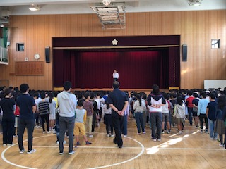 全校朝会がありました。委員会からの連絡や朝会当番の先生からのお話がありました。校長先生からは読書週間に向けて「読書に親しもう」というお話しがありました。
