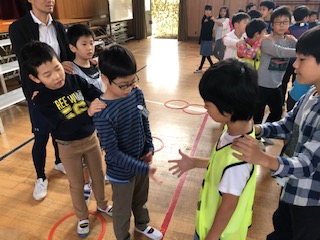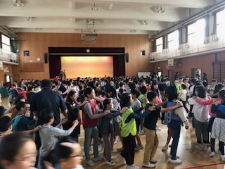 今朝の児童集会は「貨物列車!」で楽しみました。列の先頭がじゃんけんをして、負けた列が勝った列の後ろに連結して、どんどんつながっていきます。最後には長い長い貨物列車ができあがりました。