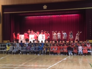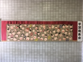 →玄関掲示が学習発表会に変わりました。講堂では2年生が練習をしました。