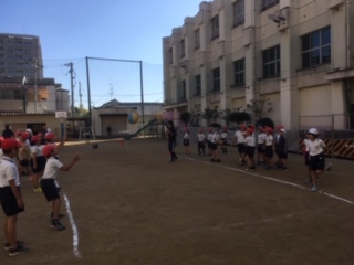 →体育の学習でボールの投げ方や受け方を学習しました。相手の受けやすいところをねらって投げました。