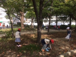 →秋見つけのため、上汐公園に行きました。赤や黄色、茶色などいろいろな色や形の葉っぱを集めました。